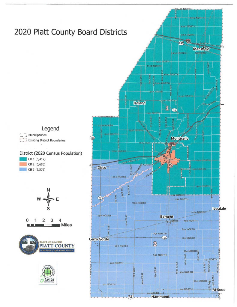 Piatt County is divided into three districts, based on population. Two members are elected from each district. The map below show the district boundaries based on the 2020 census.
